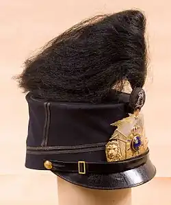 In 1806 a dark blue tunic with turned up tails and two rows of buttons on the chest. In 1845 a tunic of dark blue broadcloth, single breasted with eight buttons, open and slanted Prussian collar with a red flap on each side, red piping in the front from the collar and all the way down, around the cuffs and on the pocket flaps. Epaulettes of earlier model were worn. The trousers were of dark blue broadcloth with a red piping along the outer seam. For summer use, trousers of linen or other white fabric were used. In 1886 military surgeons got tunic m/1886 with black lining, collar and cuffs of black velvet and with three blind button holes on each cuff. Red piping along the front edge of the tunic, on the Prussian collar and around the cuffs. Epaulette straps were of golden braid and lined with red cloth. Alternativly a dark blue coat m/1888, double breasted with five buttons in each row, no cuffs and with pleated gilded shoulder straps or surtout m/1829–1854, double breasted with eight buttons in each row could be worn. Trousers m/1872 had red piping in the outer seams. Greatcoat m/1886 was of grey broadcloth. Later greatcout m/04 of greybrown-green broadcloth and with grey lining might be worn. Cap m/1865–1899 with cockade and cap button m/1865 could at parade be furnished with pom-pom and a drooping plume m/1865 of black horse hair.[5]