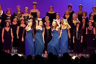 In addition, international quartet champions are awarded a tiara or crown each – every year of a different design – and are proclaimed "Queens of Harmony",[22][23] this title having been in use since at least 1960.[24] They are entitled to wear their crown at any future SAI event, even when they are not the current champions. However, they are not allowed to compete as that quartet again. The association of past quartet winners is known as the "Coronet Club".