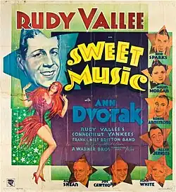 Sweet Music is a 1935 American musical film directed by Alfred E. Green, written by Jerry Wald, Carl Erickson and Warren Duff, and starring Rudy Vallée, Ann Dvorak, Ned Sparks, Helen Morgan, Robert Armstrong and Allen Jenkins. It was released by Warner Bros. on February 23, 1935.[1][2][3]