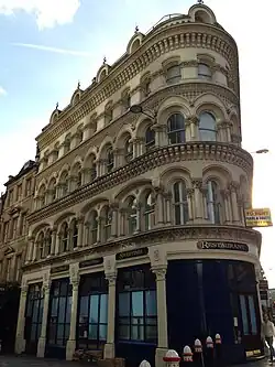 Sweetings's first incarnation was as John S. Sweetings, Fish and Oyster Merchant in Lad Lane, Islington, in 1830. The Lad Lane shop continued to supply fish and game to hotels and restaurants The restaurant later occupied sites at 159 Cheapside and 17 Milk Street, advertised as "Very Superior Oyster Rooms".[1][2] Fodor's wrote that "little seems to have changed at this time warp since the height of the British Empire".[3] The French painter Henri de Toulouse-Lautrec patronised Sweetings in the 19th century.[1] Sweetings has been owned by Richard Barfoot since 2001 who bought it from the widow of Graham Needham. Needham had owned it since 1980. Barfoot also supplies Sweeting's sustainably sourced seafood. According to Barfoot, Needham told him that the gangster George Francis once offered him £1m from a suitcase for Sweetings but Needham said, "I don't want to know and if you are going to trouble me like that you can get out now".[1] Sweetings is located in the Grade II listed Albert Buildings at 39–53 Queen Victoria Street, built in 1871.[4]