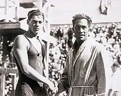 ![]() Finish of the final. Weissmuller is in lane 4, D. Kahanamoku in lane 5. | ||||||||||