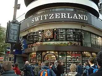 The Swiss Centre, with its distinctive clock, was a popular tourist attraction on the edge of Coventry Street, London, at its junction with Leicester Square. The 14 storey building[1] was both a showcase for Switzerland and its products, a trade and commercial centre that featured a Swiss bank, tourist office, a chocolate and souvenir shop, a Swissair ticket office, a cafe and several Swiss-themed restaurants which were located in the basement.[2]