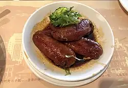 Swiss wing (traditional Chinese: 瑞士雞翼; simplified Chinese: 瑞士鸡翼; Jyutping: seoi6 si6 gai1 jik6) is a kind of sweet soy sauce-flavored chicken wings served in some restaurants in Hong Kong.[1] It is marinated in sauce made up of soy sauce, sugar, Chinese wine, and spices. Despite the name "Swiss", it is unrelated to Switzerland. Instead, it is believed to have originated in either Hong Kong or Guangzhou.[2]