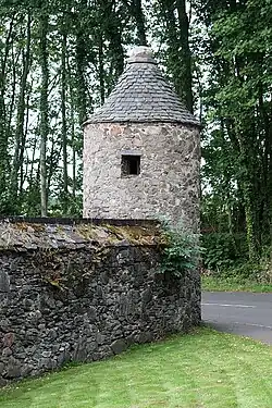 The original Swithland Hall, which stood at the eastern end of the village as it is today, on the site now occupied by Hall Farm, was destroyed by fire in 1822, although part of the hall's boundary wall, including two towers are still in existence, both of which are in Main Street.[6][9] The current hall, a Grade II listed building, was partially completed in 1834 and finished in 1852,[10] on a different site to the south-east, in what was then known as Swithland Park, by John George Danvers Butler, sixth Earl of Lanesborough.[3][11] The estate includes the Mountsorrel Cross that originally stood in Mountsorrel that dates from about 1500 and was moved to its current location in Swithland Park in 1793 by Sir John Danvers, who replaced it with the Buttermarket Cross that still stands there.[3][12]