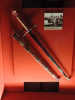 The Sword of Stalingrad (Russian: Меч Сталингра́да, romanized: Mech Stalingráda) is a bejewelled ceremonial longsword specially forged and inscribed by command of King George VI of the United Kingdom as a token of homage from the British people to the Soviet defenders of the city during the Battle of Stalingrad.[1] On 29 November 1943, it was presented to Marshal Joseph Stalin by British Prime Minister Winston Churchill at a ceremony during the Tehran Conference, in the presence of President Franklin D. Roosevelt and an honour guard.