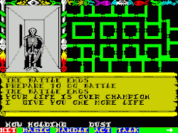 Movement through the catacombs is controlled by command inputs and keywords, which is referred to in-game as MIDAS.[1] For example, entering the word "hit" will bring down a menu and display various forms of attacking techniques.[3] The left side of the screen displays an animated first person perspective of the respective tunnel or room the player is in, whereas the right side of the interface displays a top-down view of the catacombs.[2] The bottom of the screen features a command box and announces available options or hints to the player; flashing arrows indicate where movement is possible throughout the catacombs. During the game, enemies such as gargoyles, catmen and warriors will appear at random and attack the player if confronted.[4] Magic spells such as poison and fire are able to defeat enemies, alongside weaponry like swords and axes.[1][3] The player-character has both a health and magic bar, which will slowly deplete once attacked by an enemy or by using magic spells, respectively.[4] Items in the game include treasure[2] and artefacts which may have a chance of giving the player negative effects, such as draining life and paralysing movement.[1]