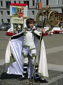 Manga Life called Syaoran "earnest" in terms of personality for how different he is from the heroic Syaoran from the series' beginning.[45] Manga News found Syaoran's personality as more as humble and comical in contrast to the angstier Sakura who does not want to see him due to the similarities between him and the clone. This was noted to have created a complex relationship within the group with the exception of Kurogane who opens up to him when interacting.[46] Anime News Network was also impressed by how Clamp illustrated Syaoran during his fight scenes in a tournament as well as against Seishiro, although the swordsmanship displayed in the latter did not reach the common appeal of Syaoran's typical fights. Instead, Santos found Syaoran's fight against Seishiro as a build up to the more important battle against his doppelganger.[47][48][49] The fact that Syaoran's sword happens to be a jian just like the Syaoran Li from Cardcaptor Sakura was found by Eries from the Fandom Post as a means of fanservice to attract more readers from such series. However, Syaron battling a doll inspired by Hikaru from Angelic Layer in a death match would come as strange to the fanbase.[50]