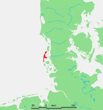In 1141, Sylt is recorded as an island, yet before the Grote Mandrenke flood it belonged to a landscape cut by tidal creeks and, at least during low tide, it could be reached on foot.[1] It is only since this flood that the creation of a spit from sediments began to form the current characteristic shape of Sylt. It is the northern and southern edges of Sylt which were, and still are, the subject of greatest change. For example, Listland was separated from the rest of the island in the 14th century and from the later 17th century onwards the Königshafen (King's Harbour) began to silt up as the "elbow" spit began to form.[2]