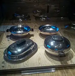 During the 1930s, she submitted her designs to numerous exhibitions, receiving a series of favourable press reports from the critics. One of the most important was in Stockholm's NK department store, where she presented her creations alongside those of the established designers Folke Arström and Rolf Engströmer. She also exhibited abroad, in Chicago (1933), New York, London and Leipzig (1934), and Paris (1937). In contrast to the mass-produced items from Hallbergs, her designs centred on far more exclusive, avant-garde creations in silver and pewter, often in electroplated silver which was in fashion at the time.[2] Her creations included an orb-shaped coffee set with wooden handles and a cocktail shaker which was marketed by the Italian company Alessi in 1989. She also designed items for mass production, including plates, bowls, casks, jugs and kitchenware. She is remembered in particular for a huge commemorative silver plaque for the Norwegian shipping firm Wilh. Wilhelmsen for their 75th anniversary in 1936.[1]