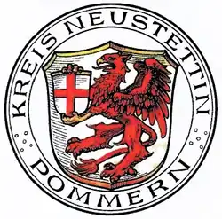 Historically, within the current boundaries of Kamień County was located Neustettin District, which existed from 1816 to 1945. Its seal depicted a red grffin with yellow (golden) claws and beak. It faced to the viewr's left, stood on its back feet, and had risen wings. It held a white (silver) Iberian style escutcheon (shield) with a red cross on it. It was placed within a white (silver) escutcheon (shield), which was encircled by a white circle that featured two rows of text with black capitalised letters. The top text read Kreis Neustettin, which in translation from German, means Neustettin District or Szczecinek District. The bottom text read Pommern, which means Pomerania.[2][3]