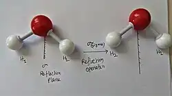 The reflection operation is carried out with respect to symmetry elements known as planes of symmetry or mirror planes.[2] Each such plane is denoted as σ (sigma). Its orientation relative to the principal axis of the molecule is indicated by a subscript. The plane must pass through the molecule and cannot be completely outside it.
