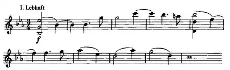 The first movement, "Lebhaft" (lively), follows the 19th-century model of a large-scale sonata form. The symphony begins immediately with a heroic theme in E♭ major, scored for full orchestra. The strong hemiolic rhythm of the main theme returns throughout the movement giving an ever-present forward push. This forward push allows for the melodies of this movement to soar over the bar lines. The transition moves from the tonic to mediant, G minor, with the use of a newly introduced motive in the strings consisting of energetic ascending eighth notes juxtaposed with material from the main theme. The subordinate theme is scored for winds and its less rhythmic drive has a gentler quality. The exposition unfolds with the return of the scale motif from the transition and main theme, ending in the dominant, B♭. Schumann does not repeat the exposition, but rather has the strings and bassoon drop from unison B♭ to an F♯, leading to a triple forte explosion in the unexpected key of G major marking the beginning of the development. The development section is composed mainly of the three main themes from the exposition. Schumann skillfully moves through a variety of keys for nearly 200 bars, never returning to E♭, until a dominant arrival preceding the climactic and triumphant return of the main theme in the home key. In a typical performance this movement lasts approximately 9 minutes.