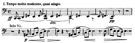 The interval of the tritone dominates the melodic and harmonic material of the piece, but in a completely different way from how it dominates the Third Symphony. It is stated immediately, in a dark phrase for cellos, double basses and bassoons, rising C–D–F♯–E over a hard unison C.