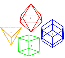 • The rational volumetric quantation or constant proportionality of the octahedron, the cube, the rhombic triacontahedron, and the rhombic dodecahedron when referenced to the tetrahedron as volumetric unity.