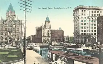 The original settlement of Syracuse was a conglomeration of several small towns and villages and was not recognized with a post office by the United States Government. Establishing the post office was delayed because the settlement did not have a name. Joshua Forman wanted to name the village Corinth. When John Wilkinson applied for a post office in that name in 1820, it was denied because the same name was already in use in Saratoga County, New York.[10] Having read a poetic description of Syracuse, Sicily (Siracusa), Wilkinson saw similarities to the lake and salt springs of this area, which had both "salt and freshwater mingling together".[11] On February 4, 1820, Wilkinson proposed the name "Syracuse" to a group of fellow townsmen; it became the name of the village and the new post office.[12]
