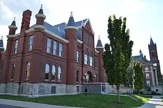 On March 24, 1870, Syracuse University was founded. The State of New York granted the new university its own charter, independent of Genesee College, which had unsuccessfully tried to move to Syracuse the year before.[13] The university was founded as coeducational. President Peck stated at the opening ceremonies, "The conditions of admission shall be equal to all persons.... There shall be no invidious discrimination here against woman.... Brains and heart shall have a fair chance...."[14] Syracuse implemented this policy and attracted a high proportion of women students. In the College of Liberal Arts, the ratio between male and female students during the 19th century was approximately even. The College of Fine Arts was predominantly female, and a low ratio of women enrolled in the College of Medicine and the College of Law.[14]