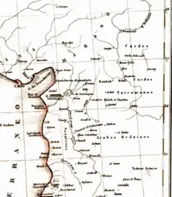 In 1260, the Mamluk Sultanate – ruled by a line of Turkish and Circassian sultans – entered Syria in response to the Mongol invasions. Whilst Cairo remained the seat of the Mamluk Sultanate, Damascus became their second capital.[17] Hence, by the thirteenth century, the Turkmen formed a part of the armies of Damascus and Aleppo, and permanently settled in these regions.[18] After the Bahri sultan of the Mamluks, Baibars, destroyed Qara he settled Turkmen in the town in 1265. Two years later, he settled more Turkmen in the Syrian coast to protect the region. The Turkmen were called on to assist in the capture of Margat by the Muslim commander of the Krak des Chevaliers in 1280.[18] The late Mamluk-era writer Ahmad al-Qalqashandi noted that Turkmen formed contingents in the regular armies of greater Syria. By the 15th century, the Muslim writer Khalil az-Zahiri recorded 180,000 Turkmen soldiers and 20,000 Kurdish soldiers in Syria.[18] The Turkmen mainly lived in the provinces of Aleppo and were settled in suburbs such as al-Hadir al-Sulaymani; they also live near the coast and the Jawlan (i.e. Golan Heights).[18]