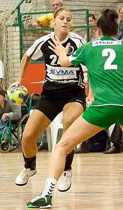 Szabina Tápai (born 30 January 1986 in Kiskunhalas)[1] is a Hungarian handballer who most recently played for Szent István SE in the second league. In 2016 she decided to retire from professional handball due to an argument with her coach, Rita Deli. Her coach did not like the fact, that Tápai and her family were taking part in a reality show beside other media appearances.[2] One year later she joined the team of Szent István SE. In 2018 she announced her retirement from handball and pregnancy at the same time.