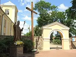 The town is located in the north-eastern outskirts of Mazovia, which has been part of Poland since the establishment of the state in the Middle Ages. In 1437, the Szczuka noble family of the Grabie coat of arms purchased the land, on which they founded the village, which was initially named Szczuki-Litwa.[2] Thanks to the efforts of Stanisław Antoni Szczuka, Szczuczyn was granted town rights around 1690 by Polish King John III Sobieski.[3] Szczuka brought the Piarists to the town and a Baroque Piarist church and monastery complex was built, which remains the greatest landmark of the town.[3] Szczuka also built a Piarist college, for which the Polish King established a scholarship fund.[3] Szczuczyn was a private town, administratively located in the Masovian Voivodeship in the Greater Poland Province of the Polish Crown. Stanisław Antoni Szczuka, who died in Warsaw in 1710, was buried in the local Piarist church. In the 18th century the town passed to the powerful Potocki family.[3] Factors that largely contributed to the development of the town were the presence of the school and the location on a trade route connecting Białystok and Königsberg.[3] Among the teachers of the Piarist college were Jakub Falkowski, who then founded the oldest Polish school for deaf people in Warsaw, and Polish philosopher Bronisław Trentowski.[3]