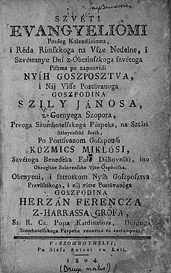 Szvéti evangyeliomi (The Holy Gospels), later Szvéti evangeliomi, is the first Catholic translation of the Bible into Prekmurje Slovene. It was written by Miklós Küzmics (1737–1804), the dean of Prekmurje and the Rába Valley. The publication in 1780 was financed by János Szily, the first bishop of Szombathely. Szvéti evangyéliomi had a significant role in the formation of standard Prekmurje Slovene. It was a standard for numerous works published in Prekmurje from 1780 until 1920.