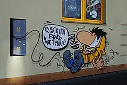 Szwedzki is an immigrant from Sweden living in Sosnowiec.[3][4][5] He painted his first murals in 2000.[2][6] In the early years, his work was sometimes described as vandalism, but in later years, with the growing popularity of street art in Poland, it became accepted as a form of regional art.[7] The artist's goal is to entertain viewers.[2] Szwedzki's later murals often include a humorous comment in the form of a comic-style speech bubble.[2][7][8][9]