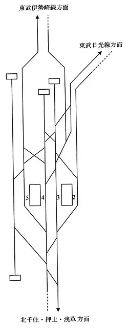 The station is served by the Tobu Skytree Line, and forms the starting point of the Tobu Skytree Line, Tobu Isesaki Line and the Tōbu Nikkō Line. It is 41.0 km from the line's Tokyo terminus at Asakusa.[1]