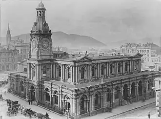 The name "Otago Museum" was first used by James Hector to describe his geological collections on display at the 1865 New Zealand Exhibition, held in Dunedin.[2] Some of these collections were the nucleus of the Otago Museum, which first opened to the public on 12 September 1868.[3][4] The museum was originally located in the Dunedin Exchange building on Princes Street. As the collection began to grow, it soon became clear that a larger, purpose-built site was required; the foundation was laid at the current Great King Street site in December 1874. In August 1877, the new building was opened and remains a part of the museum today. The original entrance to the museum, with its Oamaru stone Doric-style pillars, is still visible on Great King Street, though the main entrance is now from the Museum Reserve.