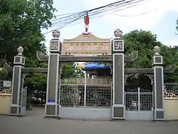 The Triple Gate (Tam Quan) is accessible by both pedestrians and vehicles. Two-wheeled vehicles and pedestrians use the left and right wings respectively, and cars, buses, and trucks can use the central wing. The three gates represent emptiness, impermanence and middle-view.[8] It is decorated with sculptures and engravings of lotuses, lanterns and swastikas, all prominent symbols in Buddhism.[9] On the left hand side of the grounds, there is a Bodhi tree, a symbol of the enlightenment of the Buddha. The tree is located in a concrete lotus, and around it are eight samsara-wheel-shaped signs that represent the Noble Eightfold Path. Signs with text explain each of the eight paths.[9]