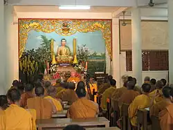 The lay attendees at Tinh Xa Trung Tam are predominantly female by a ratio of around 5 to 1, and most of the temple-goers are over 40. Most of the younger lay disciples are relatives of regular, older attendees. In addition to local residents, who make up the bulk of the disciples, some are from other parts of Vietnam, as well as overseas Vietnamese who are temporarily in the country.[14] According to the American professor of Vietnamese history and religion Mark W. McLeod, who did fieldwork at Tịnh Xá Trung Tâm, he did not survey the laypeople about their income, for fear of embarrassing them, but conjectured that most had an above average income as they were able to devote a considerable amount of time to organized religious activity instead of working longer hours.[14] A regular occurrence at the temple is the weekly Bát Quan Trai Giới (Eight Precepts Ritual). As part of this, the participants take on three additional vows apart from the Five Precepts and stay at the temple for a 24-hour period. These vows prohibit adornments such as makeup and jewellery, the use of comfortable beds and chairs, and eating impurely.[15] During the retreat day, meals are taken in silence and talking is avoided, apart from during dharma talks, sutra chanting and religious debate. Meditation is also a part of the routine.[16] Tinh Xa Trung Tam holds the Eight Precepts Ritual more often than any other institution in the city; the next most frequent temple holds the retreat once every two weeks.[13] Dharma talks are held weekly by the resident monks and nuns, which is generally more frequent than at other places in the city. The disciples and monks at the temple told McLeod that they chose Tinh Xa Trung Tam because of what they regarded as a higher level of discipline, rigor and scholarship at the institution.[13] The monks are transported by their disciples as they are forbidden to drive.[17]