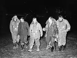 Another problem for the film was the need for a group of experienced pilots to fly the aircraft. Mahaddie made a request to the Ministry of Defence asking for a select group of pilots to be seconded to the film company, the pilots preferably coming from the Central Flying School. After some deliberation the Ministry of Defence came up with a list of ten flying instructors, all of whom had many hours experience of fighter type aircraft. They were led by Wing Commander George Elliot from RAF HQ Flying Training Command.[21] A group of pilot instructors from Spain were also used, as were a group of ex-service pilots from the United States.[22] These men enabled the film to have its spectacular dogfight sequences, using authentic aircraft flown by capable pilots well versed in the aggressive use of their aircraft.