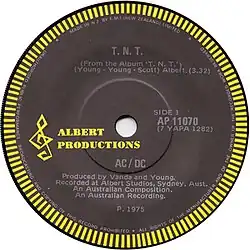 "T.N.T." is a song released in 1975 by Australian hard rock band AC/DC, taken from their Australian album T.N.T. and the international version of High Voltage. It was released as a single in 1976 and was written by Bon Scott, Angus Young and Malcolm Young. It peaked at No.19 on the Australian Kent Music Report Singles Chart.[1] The song's title is a reference to the explosive chemical TNT.