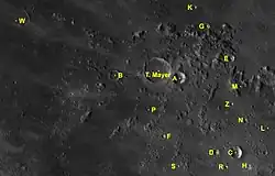 By convention these features are identified on lunar maps by placing the letter on the side of the crater midpoint that is closest to T. Mayer.