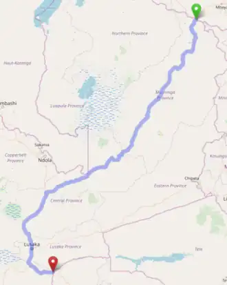 From Nakonde, the T2 goes southwards for 86 km (53 mi) to the town of Isoka. From Isoka, the road goes south-west for 263 km (163 mi), bypassing Chinsali (Muchinga Province's Capital), through Shiwang'andu District (where it bypasses Lake Ishiba Ng'andu and the Shiwa Ngandu Estate), to the town of Mpika, where it meets the southern terminus of the M1 road from Kasama and Mbala.[2] The name Great North Road used to apply to the M1 road up to the Mbala Border with Tanzania, but the name has since been given to the T2 road to Nakonde, due to its direct route to important towns in Tanzania.[8][9][10]