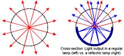 Some lamps have an internal opaque reflector. Coverage of the reflector ranges from 120° to 310° of the lamp's circumference.