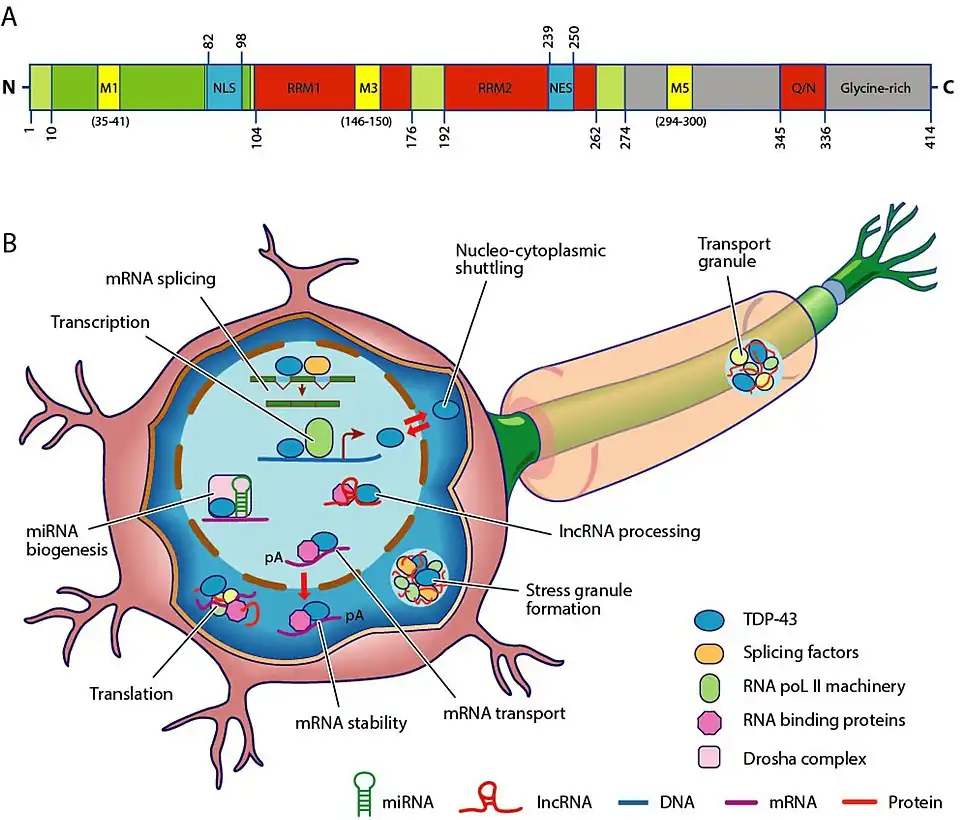 (B) The TDP-43 protein is critical for mediating RNA metabolism. In the nucleus, TDP-43 is important for transcription and splicing of messenger RNA (mRNA), as well as maintaining RNA stability (pA) and transport to nucleus. In addition, TDP-43 regulates biogenesis of microRNA (miRNA) and processing of long non-coding RNA (lncRNA). Although predominantly located within the nucleus, TDP-43 shuttles between the nucleus and the cytoplasm. In the cytoplasm, TDP-43 participates in mRNA stability, translation, formation of stress and ribonucleoprotein (RNP) transport granules. From a review by de Boer et al., 2020.[51]