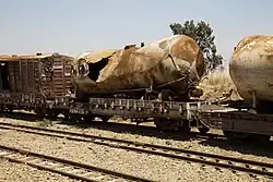 The work involved moving 330,000 tons of rail and 89 million cubic meters of earth and rock, and the construction of 93 stations, 320 bridges, 22 tunnels and 2,225 culverts.[56][61] Virtually all building materials, equipment and significant amounts of food and medical supplies were shipped from China.[56] According to Du Jian, a Chinese interpreter, China "shipped out more than 1.5 million tonnes of materials, including steel rail, cement, and dynamite, and daily necessities, even though it suffered itself a dire shortage of all commodities."[47] Braving rain, sun and wind, the workers laid the track through some of Africa's wildest and most rugged landscapes. One Chinese worker recalled that his team was trapped in the wilderness for a week after floods and landslides washed away the only connecting road.[56] "We lived in fear of lions and hyenas."[56] Another interviewee stated that conditions were often so bad that "[s]ometimes we had to drink the water that we found in the elephants' footprints."[2] Medical care was so lacking that one Chinese worker died due to an untreated bee sting.[62] Over 160 workers, including 64 Chinese nationals, died in construction accidents.[61] However, construction accidents were not the only cause of death. Food for Chinese workers was sent from China, and shipping delays often meant that the food, typically nothing more than dehydrated vegetables and other basic goods like wheat flour, was moldy when it arrived, causing working conditions to become even more dire.[47] Some of the victims were buried in a cemetery in Tanzania.[63]