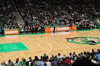 TD Garden is one of two NBA arenas (along with Kia Center, home of the Orlando Magic) with parquet floors. The Celtics are best known for the tradition of the parquet floor from their Boston Garden years, originally built after World War II because of cost and the scarcity of lumber in that time. The original floor, first used in Boston Arena and later the Boston Garden, was brought over to the then-FleetCenter and remained there for four seasons. A newly refurbished parquet floor, featuring a combination of old and new sections, was then unveiled during the 1999–2000 season, before it was replaced with a new floor prior to the 2015–16 season.[34] Since the 2007–08 season, a signature of long-time Celtics coach Red Auerbach was added to the floor, and prior to the 2022–23 season, Bill Russell's jersey #6 was also added.[35] The Celtics are also the only NBA team to use an oak floor, whereas the other 29 teams use maple floors.[34] In 2023, the Celtics used an alternate court design specific for the NBA in-season tournament, which is a traditional maple floor painted mostly dark green except for the middle strip which is painted light brown. The free-throw lanes and center circle incorporated the NBA Cup trophy for the tournament.[36] For the 2024 NBA Cup, the court used was based on the team's "Statement" alternate uniform, this time incorporating a green gradient painted surface inspired by the iconic parquet floor.[37]