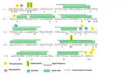 TMEM241 is predicted to undergo various phosphorylations,[11] glycation,[11] palmitoylation.[12] For example, TMEM241 isoform 1[13] has a phosphorylation sites on S6, 64, 170, 177, 291, 295 and 296;[11] glycation sites on K125, 169 and 172;[11] palmitoylation sites on C13, 15, 221.[12]