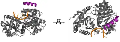 DDX39, or U2AF65-associated protein 56 (UAP56, Sub2 in yeast) is a DEAD-box ATPase essential for pre-mRNA splicing,[13] but is also a key component of the TREX complex. DDX39 is very similar to UAP56, sharing 90% of the amino acid sequence.[1] UAP56 travels along genes with the THO complex, where it interacts with the sugar-phosphate backbone of the mRNA.[14] UAP56 functions to recruit ALYREF, an RNA export adaptor, to the spliced or intronless mRNA.[15][6] After transfer of the mRNA from UAP56 to ALYREF, UAP56 dissociates from the complex, allowing the binding of export factor NXF1 to ALYREF at the same site.[16][4]