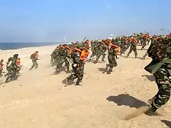 Hundreds of Infantry soldiers rushing towards simulated enemy targets at Madhavpur beach, Gujarat, during Exercise Tropex-09