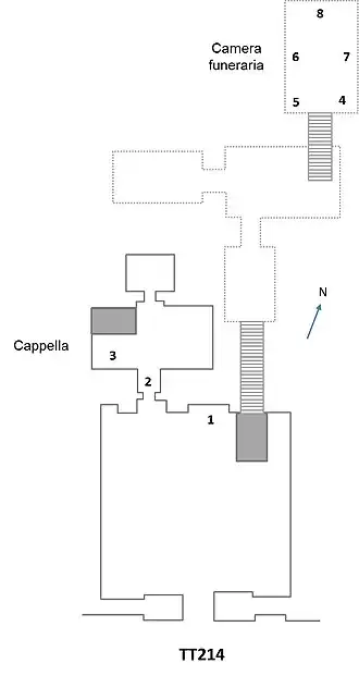 TT214 consists of a court which opens into a chapel. From the court a set of stairs lead to a passageway with a suite of chambers which include a burial chamber at the end. The tomb was furnished with a pyramid.[1]
