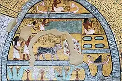 On the opposite side of the burial chamber are scenes of Amennakht and his wife Iymway harvesting wheat in the afterlife and ploughing the fields with a cow.