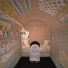 TT338 or chapel of Maya is the burial place of the ancient Egyptian artist Maya and his wife Tamyt in the necropolis of Deir el-Medina near modern Luxor, Egypt.[2] Maya was titled "outline-draughtsman of Amun" and was active in the late Eighteenth Dynasty. The chapel was discovered and excavated in 1905-1906 by the Italian egyptologist Ernesto Schiaparelli, near the Tomb of Kha and Merit.[2] The painted interior depicts the funerary procession and feasts of the deceased; the decoration was detached by the restorer Fabrizio Lucarini in 1906 and is housed today in the Museo Egizio in Turin, Italy.[2]