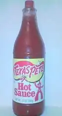 The brand has 6, 12, and 24 ounce bottles with bright red sauce, flip top, and white and yellow label featuring the name in red and "Texas Pete," a red silhouette cowboy. Texas Pete is fairly mild, registering 747 on the Scoville heat scale.[3] Its auxiliary branded Hotter Hot Sauce is claimed to be three times hotter than original Texas Pete. Texas Pete also makes a sautéed garlic hot sauce. In 2013, Texas Pete introduced the "Cha!" Sriracha sauce.[4] Sabor! by Texas Pete was released in 2016 as their Mexican style hot sauce. In 2015, the TW Garner Food Company discontinued production of its Texas Pete Chili Sauce for hot dogs and hamburgers.[5]