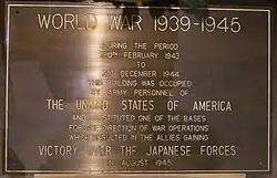 The building was taken over by Lieutenant Robert Melloy of the Hirings Section, No. 1 Lines of Communication (No. 1 L of C), Australian Army, and was occupied from 20 February 1943 to 31 December 1944.[1] The tenants of the building resisted the occupation, led by a Dr Streeter, and they formed a committee to submit a protest to the Federal Government.[1] Lt. Melloy agreed to help them submit their protest, on the condition that they vacate the premises immediately a decision was made. Two hours after submitting their protest, Lt. Melloy received orders to proceed with the military occupation of the building. Upon being advised by Lt. Melloy of the outcome, Dr. Streeter was one of the first to leave the building.[1] The building was used as the Headquarters for the US Army Forces in the Far East.[1]