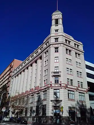 The T & G Building is a seven-storey rendered brick building in the English Renaissance style with a corner tower. It originally consisted of five storeys with a basement, with an additional two floors added after the building was bought by T & G.[3][1][2]