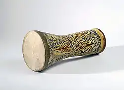 A taarija (plural: ta'arij) is a Moroccan membranophone (drum), single skin and tube, played singly, unlike the tabla, which is a pair of drums, and is related to the darbouka. While the tube may be metal (e.g., silver), it is typically made of baked clay.[1]