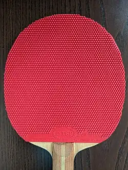 Table tennis rubber is a type of rubber used as covering on a racket in table tennis.[1] Modern table tennis rubber is usually composed of two layers: a layer of foam ("sponge") underneath and a layer of actual rubber on the surface.[2] There are four common types of table tennis rubbers: short pips, long pips, antispin, and inverted.[1] The thickness and density of the sponge layer underneath also affects how the rubber will handle the ball.[3]