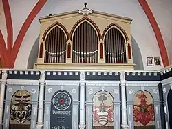 The christening bowl of 1671 shows the arms of the von Röbel family, who donated it. The parapet of the organ loft (17th century) features vivid flat carvings and again the arms of the von Röbel family. Two further sculptures of female saints (around 1430) belong to the furnishings. An oval epitaph commemorates Hans Christoph von Röbel (d. 1671). On the eastern outside wall, four plates recall the four major restructurings of the church in 1738, 1801, 1905, and 1924.