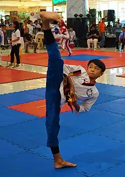Taekwondo (/ˌtaɪkwɒnˈdoʊ, ˌtaɪˈkwɒndoʊ, ˌtɛkwənˈdoʊ/; Korean: 태권도; [t̪ʰɛ.k͈wʌ̹n.d̪o] ⓘ) is a Korean martial art and combat sport involving primarily kicking techniques and punching.[7][8][9] "Taekwondo" can be translated as tae ("strike with foot"), kwon ("strike with hand"), and do ("the art or way"). In addition to its five tenets of courtesy, integrity, perseverance, self-control and indomitable spirit, the sport requires three physical skills: poomsae (품새, Form), kyorugi (겨루기, Sparring) and gyeokpa (격파, Breaking Technique).